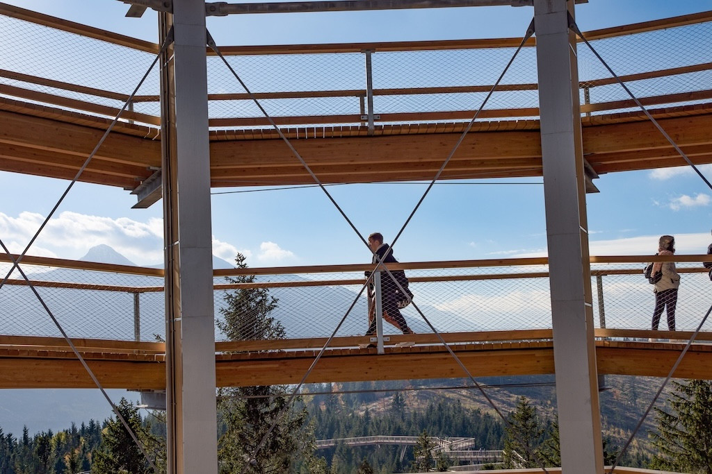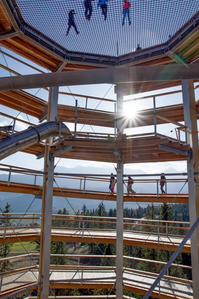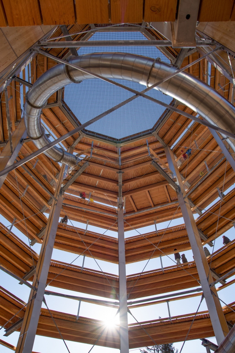 Die Höhe des Turms ermöglicht Ausblicke über drei verschiedene Gebirgslandschaften. Unterwegs sorgen Lern- und Erlebnisstationen für Abwechslung. Auch der Weg selbst ist sanft ansteigend und mit einer durchgehenden Geländerführung versehen.